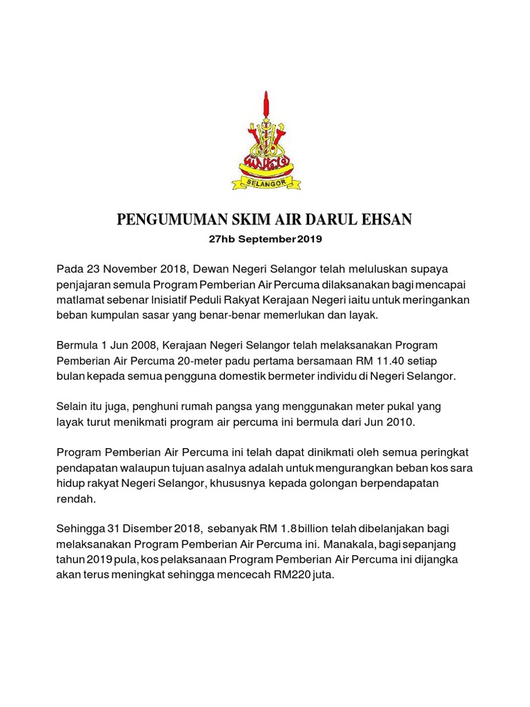 Seramai 250,000 pemegang akaun meter individu di selangor layak menerima bantuan air percuma menerusi skim air darul ehsan berdasarkan kenyataan exco infrastruktur selangor pada. In light of charity practices in ramadan and helping those in need, air selangor through the corporate social responsibility program of sama mara has given help to the less fortunate communities ahead of hari raya aidilfitri. Sebelum ini diberi nama program air percuma bakal memberi manfaar kepada selurug penduduk negeri selangor yang layak. Berita baik buat penduduk selangor dengan pendapatan isi rumah rm4,000 dan ke bawah layak untuk menikmati skim pemberian air percuma bermula 1 mac tahun hadapan. Skim percuma ini diberikan kepada mereka yang layak.